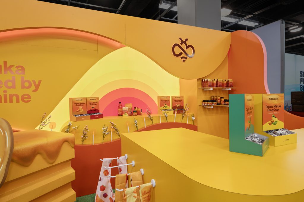 Held at the Anaheim Convention Center, Expo West is never short on energy—or competition for attention. Yet throughout the run of the show, the Wedderspoon booth consistently drew strong crowds. Attendees weren’t just passing through—they were stopping, engaging, and spending time in the space. The combination of bold visual elements and thoughtful detailing created an environment that invited curiosity and rewarded it.